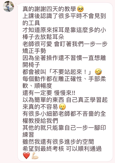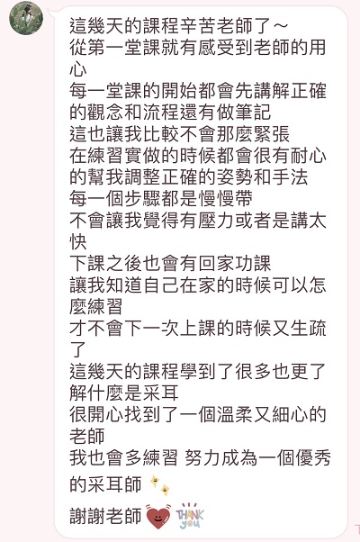 現在市面上有很多打著兩天速成班的名號,對外招募學生的 “老師” ,一個梯次就收上十幾二十人!對於采耳師這種亟需專業的職業,在這樣如同升學補習班的環境裡,一個老師對上二十幾名學員,且只用短短兩天的時間,真的能完整復刻采耳產業的秘辛嗎?
